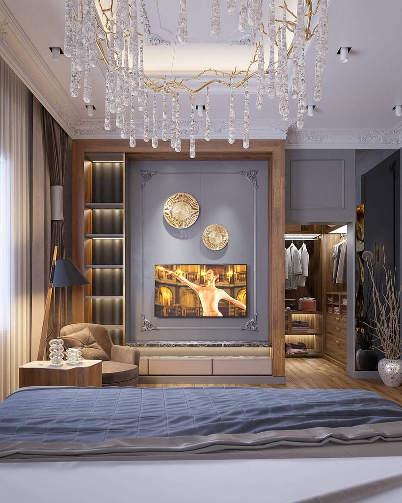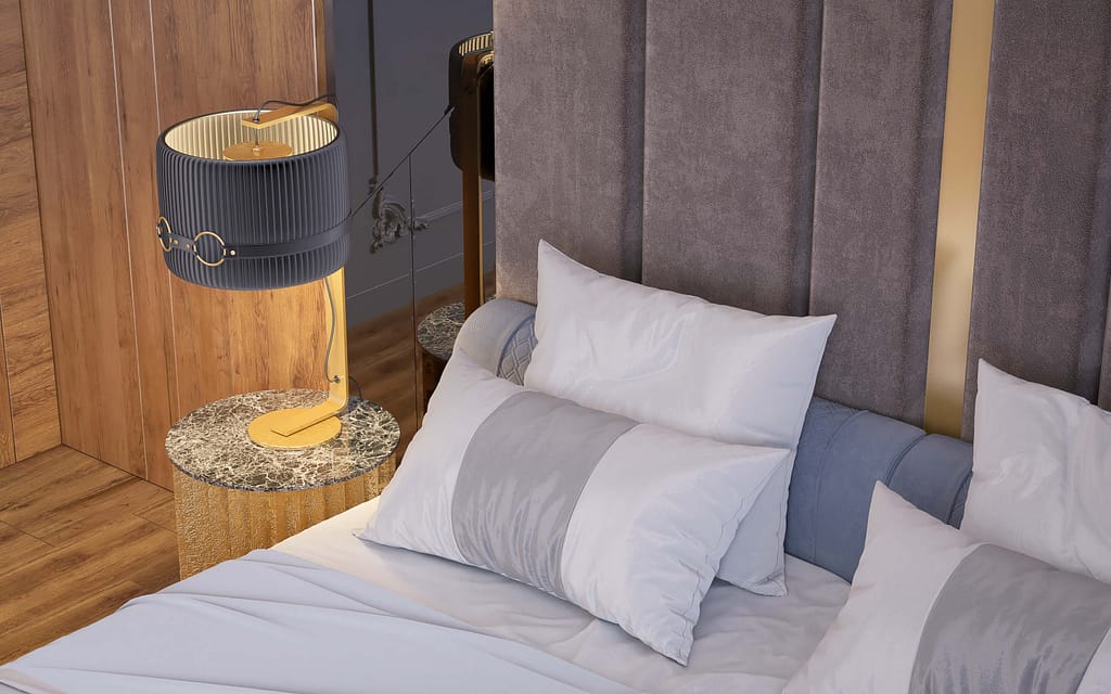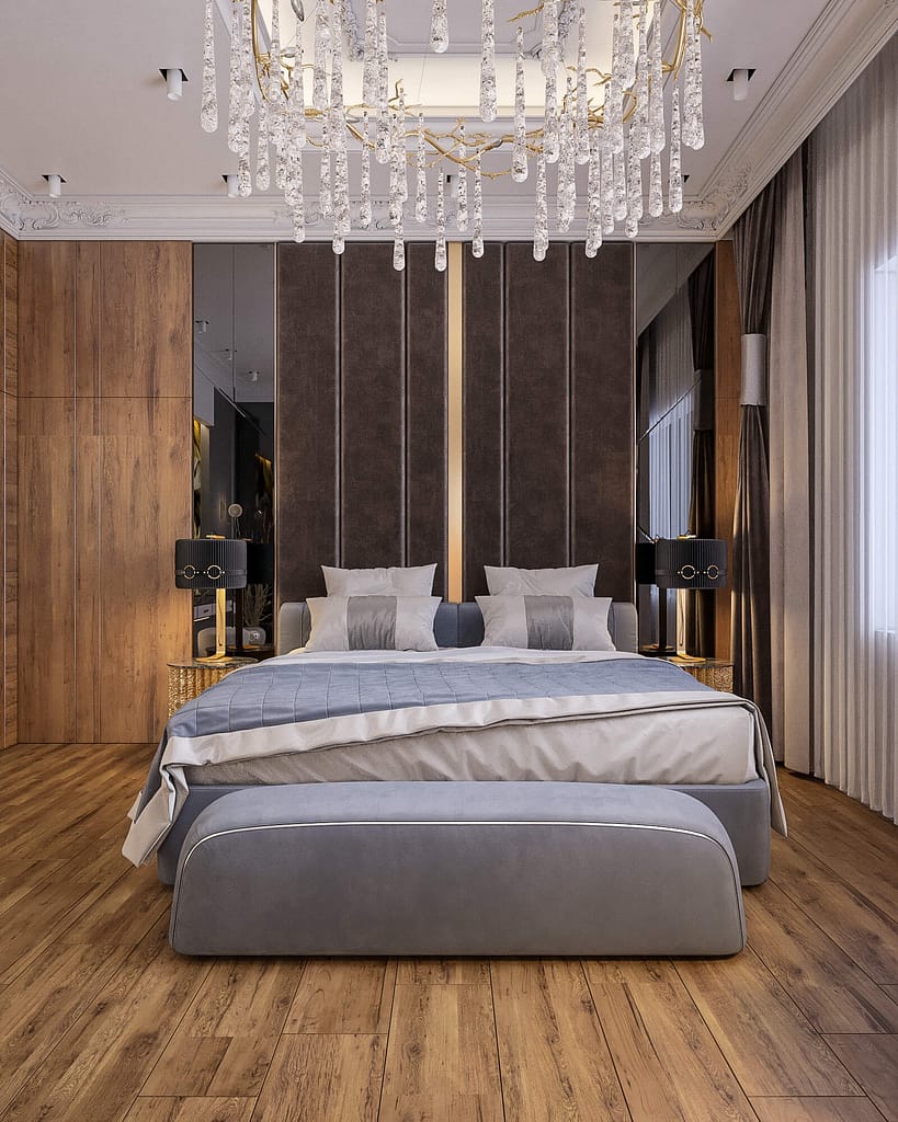Lighting plays a central role in creating ambience. Ceiling lights, bedside lamps, and concealed LED strips produce layered illumination. Furthermore, large windows enhance natural brightness, while carefully chosen curtains or blinds control light and privacy.